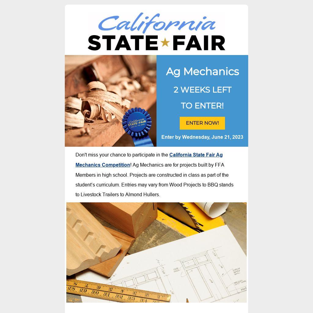 Don't miss your chance to participate in the California State Fair Ag Mechanics Competition! Ag Mechanics are for projects built by FFA Members in high school. Projects are constructed in class as part of the student’s curriculum. Entries may vary from Wood Projects to BBQ stands to Livestock Trailers to Almond Hullers.