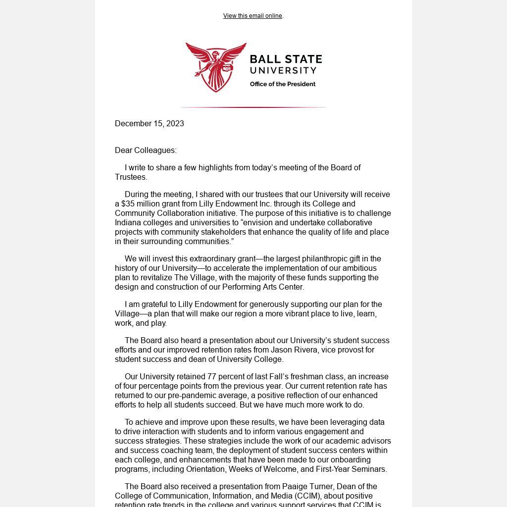 During the meeting, I shared with our trustees that our University will receive a $35 million grant from Lilly Endowment Inc. through its College and Community Collaboration initiative. The purpose of this initiative is to challenge Indiana colleges and universities to “envision and undertake collaborative projects with community stakeholders that enhance the quality of life and place in their surrounding communities.”