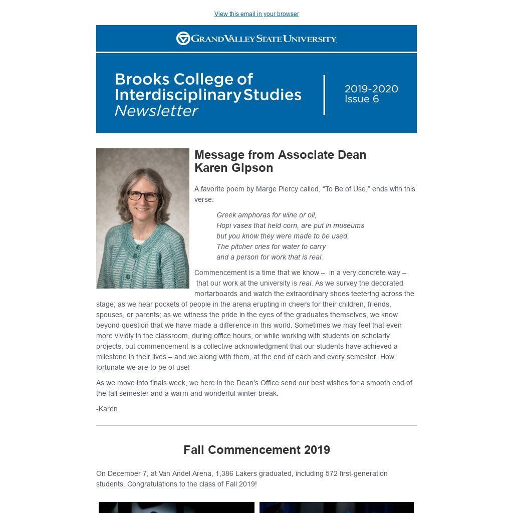 Commencement is a time that we know – in a very concrete way – that our work at the university is real. As we survey the decorated mortarboards and watch the extraordinary shoes teetering across the stage; as we hear pockets of people in the arena erupting in cheers for their children, friends, spouses, or parents; as we witness the pride in the eyes of the graduates themselves, we know beyond question that we have made a difference in this world. Sometimes we may feel that even more vividly in the classroom, during office hours, or while working with students on scholarly projects, but commencement is a collective acknowledgment that our students have achieved a milestone in their lives – and we along with them, at the end of each and every semester. How fortunate we are to be of use!