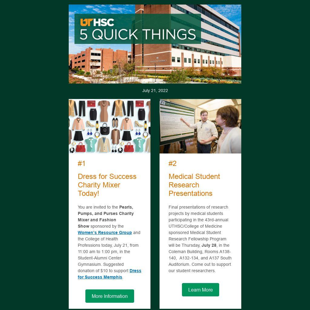 Final presentations of research projects by medical students participating in the 43rd-annual UTHSC/College of Medicine sponsored Medical Student Research Fellowship Program will be Thursday, July 28, in the Coleman Building, Rooms A138-140, A132-134, and A137 South Auditorium. Come out to support our student researchers.