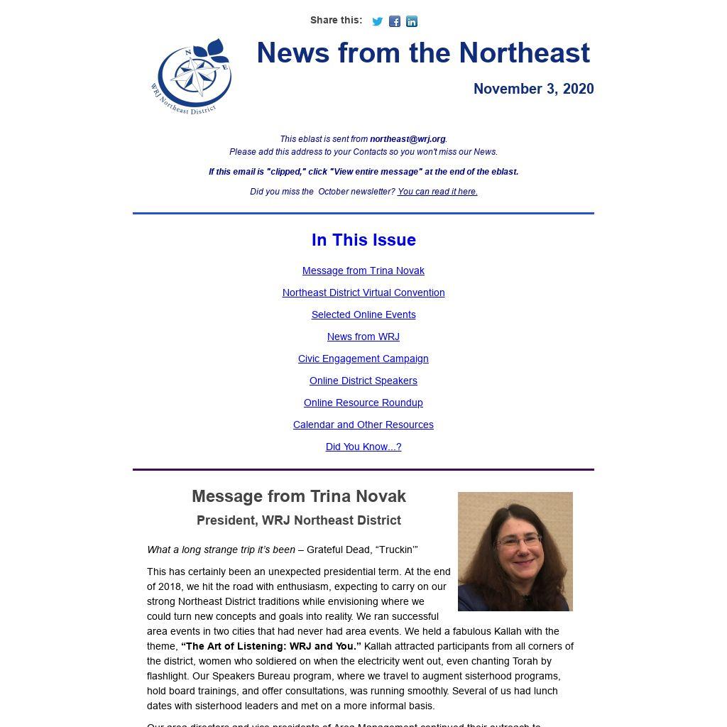 I am honored to have served as the Northeast District president these past two years. I know the district remains healthy, and that our new Board of Directors will ably move us forward into the next term. As the WRJ tagline states, we are Stronger Together. May we remain so.