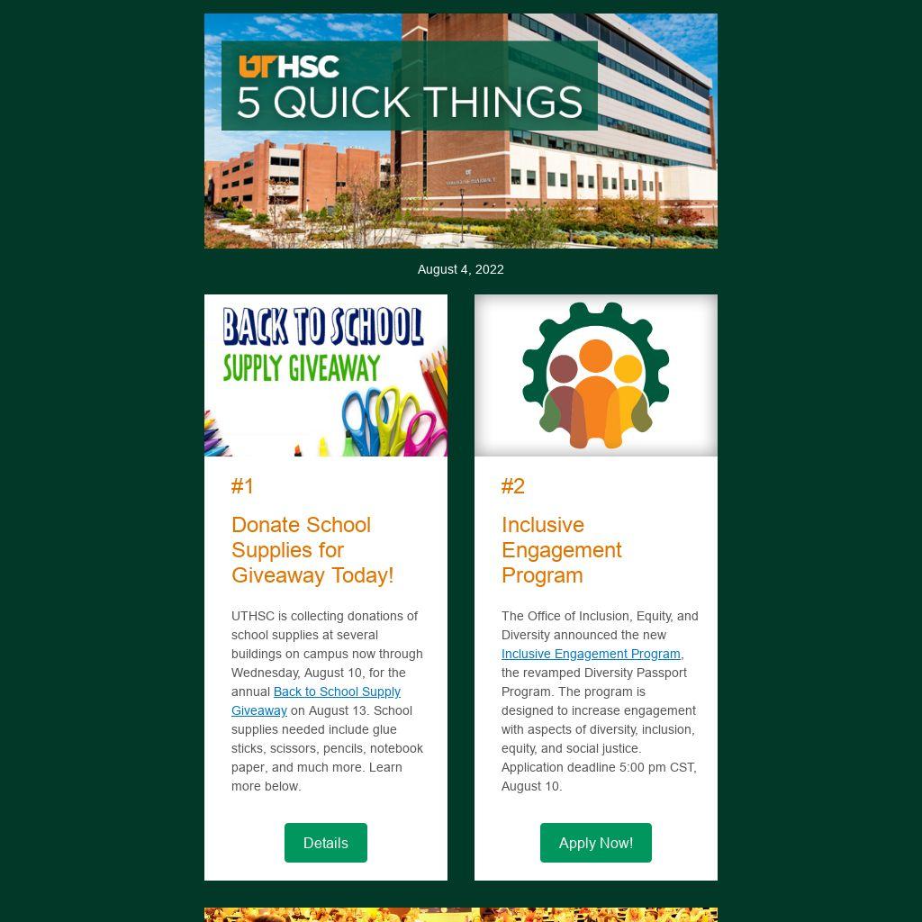 UTHSC is collecting donations of school supplies at several buildings on campus now through Wednesday, August 10, for the annual Back to School Supply Giveaway on August 13. School supplies needed include glue sticks, scissors, pencils, notebook paper, and much more. Learn more below.