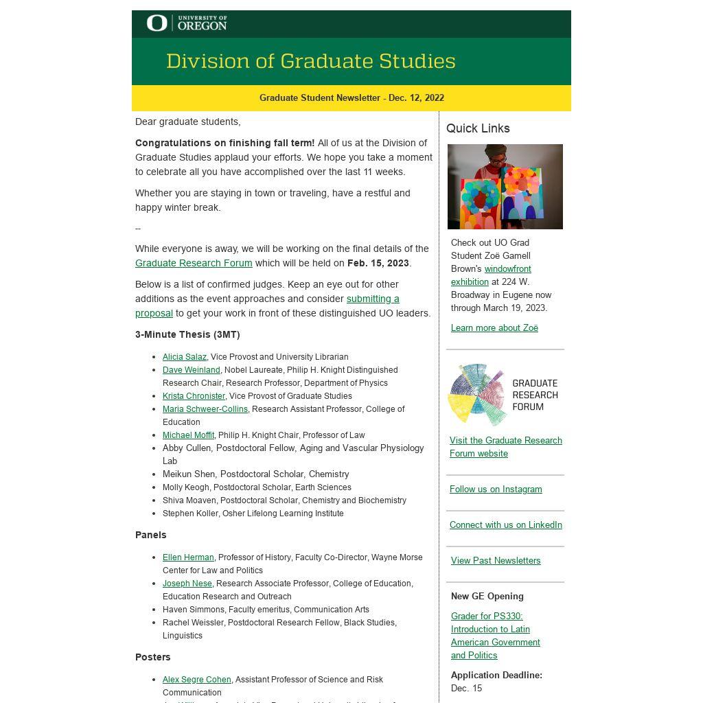 Congratulations on finishing fall term! All of us at the Division of Graduate Studies applaud your efforts. We hope you take a moment to celebrate all you have accomplished over the last 11 weeks.
