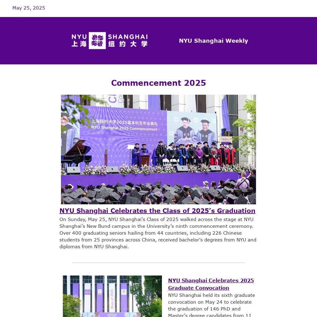 Commencement Weekend CelebrationsOn Friday, May 23, members of the Class of 2025 met at Shanghai’s iconic Pearl Tower at dusk to witness the tower lit up in purple in honor of NYU Shanghai. The next day, the Class of 2025 celebrated at Grad Alley, a lively street fair organized in collaboration with the New Bund community, featuring live performances, local vendors, and the lighting of the New Bund Center.