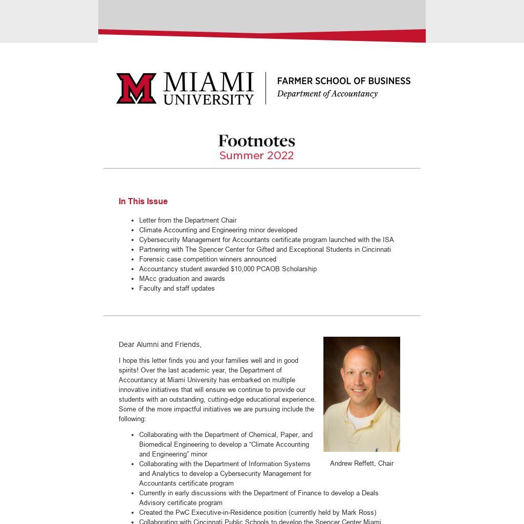 I hope this letter finds you and your families well and in good spirits! Over the last academic year, the Department of Accountancy at Miami University has embarked on multiple innovative initiatives that will ensure we continue to provide our students with an outstanding, cutting-edge educational experience. Some of the more impactful initiatives we are pursuing include the following: