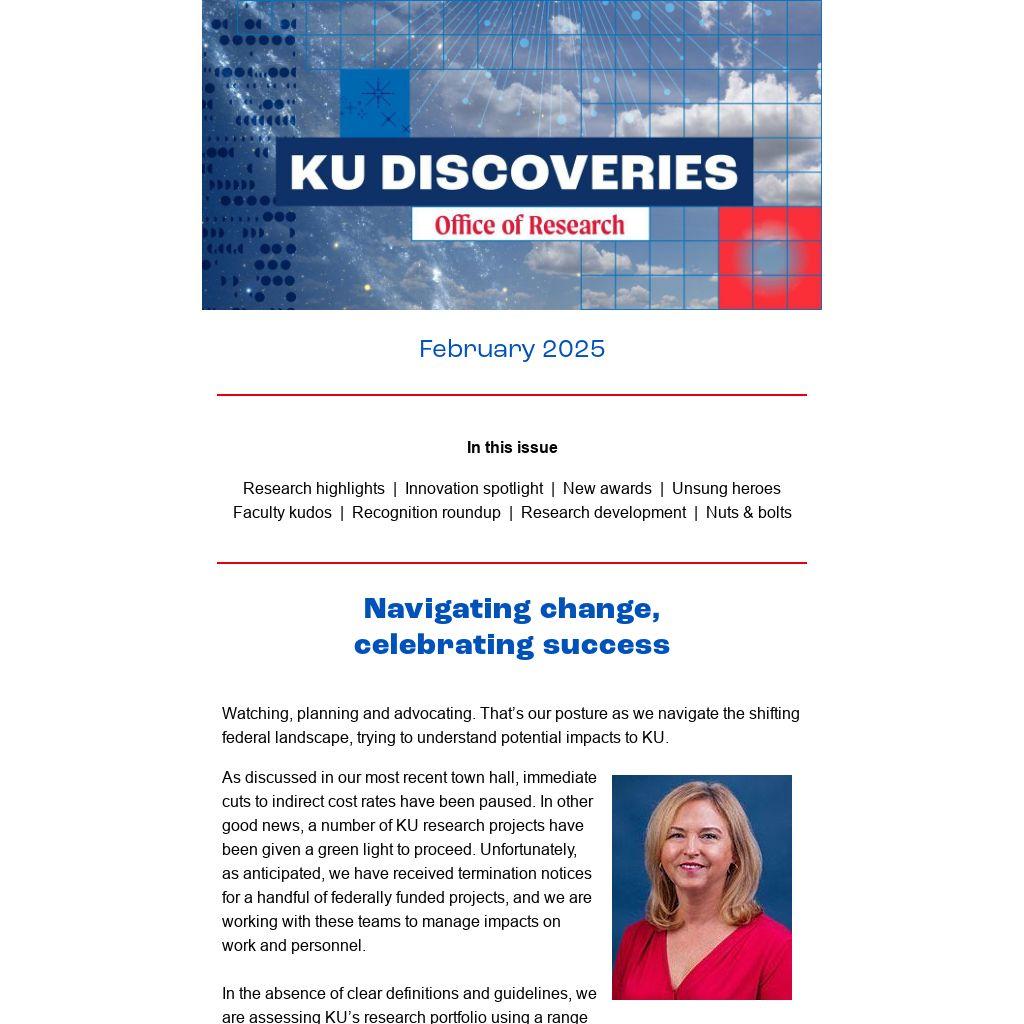 The Federal Research Updates webpage contains information and guidance for the KU Lawrence/Edwards research community about potential impacts of recent federal actions. Find an archive of KU messages and town hall recordings, evolving guidance for investigators, and resources to increase understanding and advocacy for indirect costs.