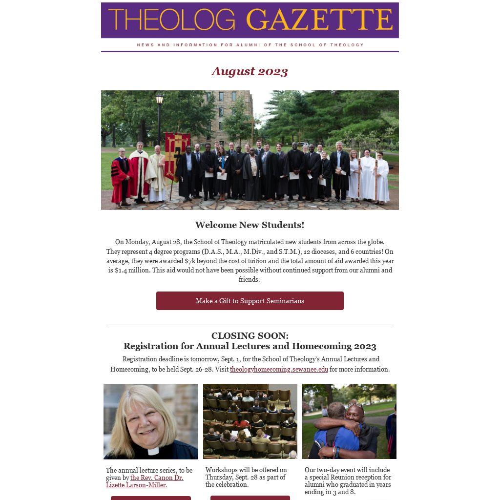 Registration deadline is tomorrow, Sept. 1, for the School of Theology’s Annual Lectures and Homecoming, to be held Sept. 26-28. Visit theologyhomecoming.sewanee.edu for more information.