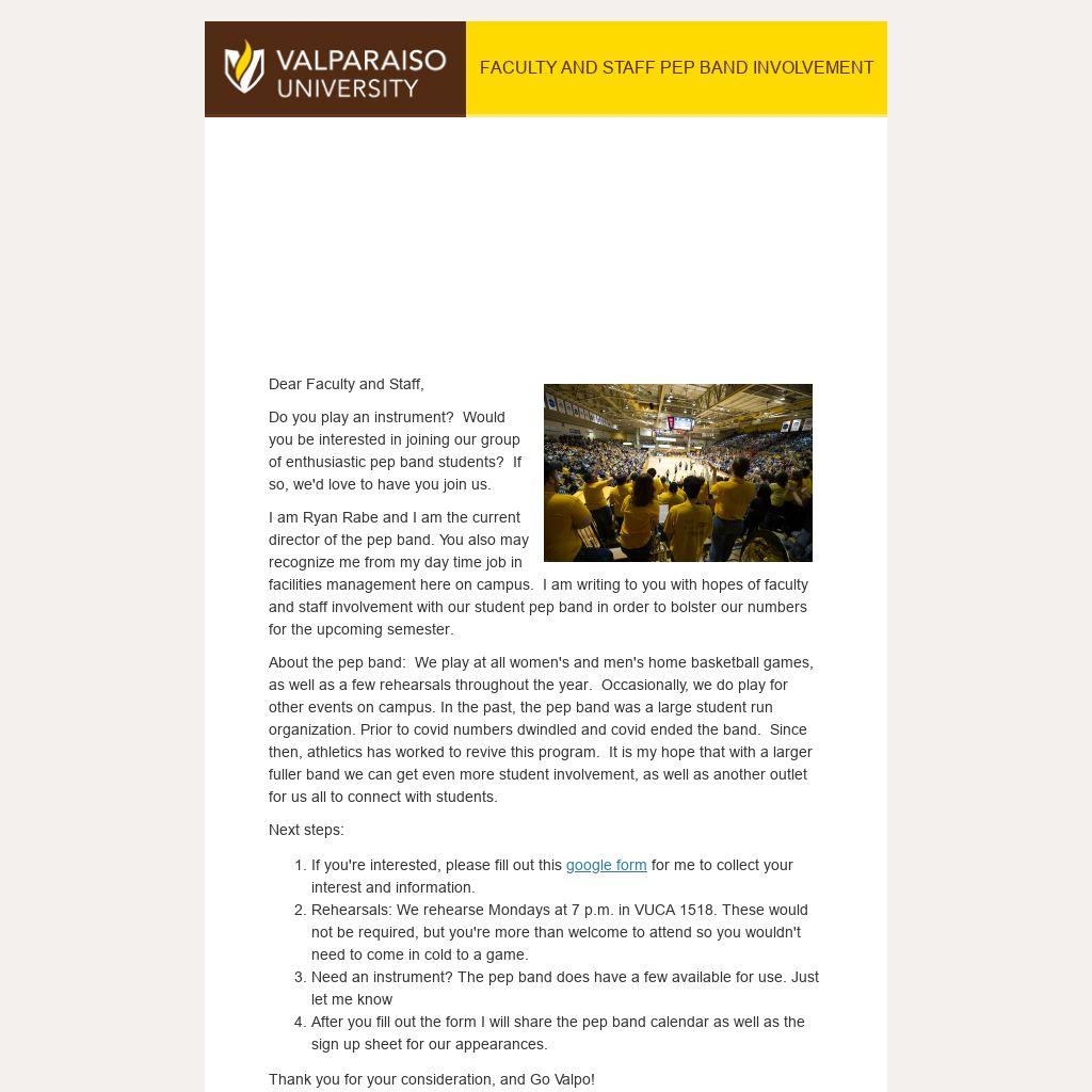 I am Ryan Rabe and I am the current director of the pep band. You also may recognize me from my day time job in facilities management here on campus. I am writing to you with hopes of faculty and staff involvement with our student pep band in order to bolster our numbers for the upcoming semester.
