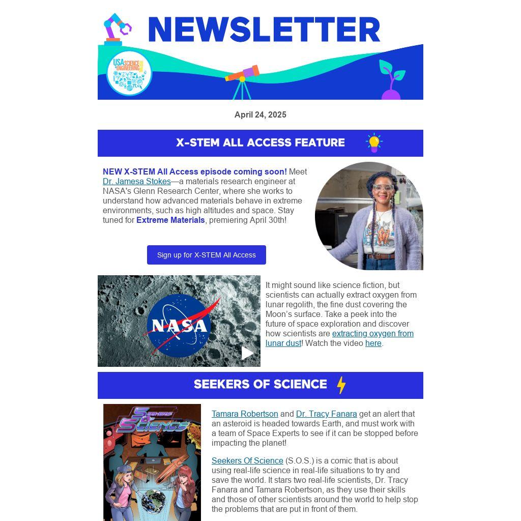 NEW X-STEM All Access episode coming soon! Meet Dr. Jamesa Stokes—a materials research engineer at NASA's Glenn Research Center, where she works to understand how advanced materials behave in extreme environments, such as high altitudes and space. Stay tuned for Extreme Materials, premiering April 30th!