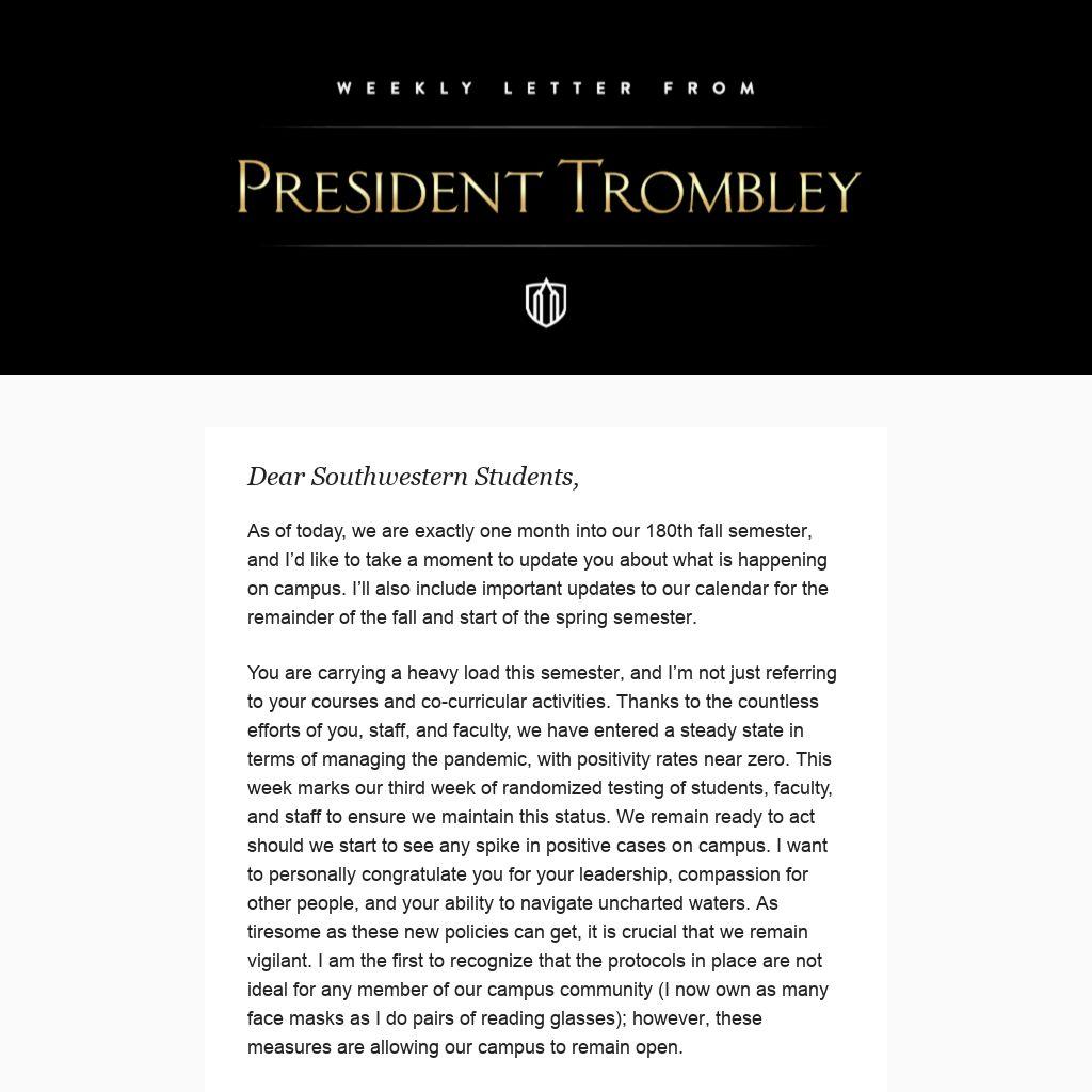 We are following CDC recommendations for quarantine and isolation, and are continuing our series of communications to reinforce the importance of staying vigilant about wearing masks and maintaining physical distancing. Our student-athletes continue to train responsibly, and we will post the spring schedules for applicable sports as soon as the respective athletic conferences release this information. For students who may be struggling, our Counseling Center is open and ready to assist. This semester has created challenges for all Southwestern students, but especially for our newest Pirates looking to make connections and build friendships. Student Life and other offices and organizations across campus are constantly creating great opportunities to socialize, and I want to encourage you to step out of your comfort zone and participate. You can view upcoming events