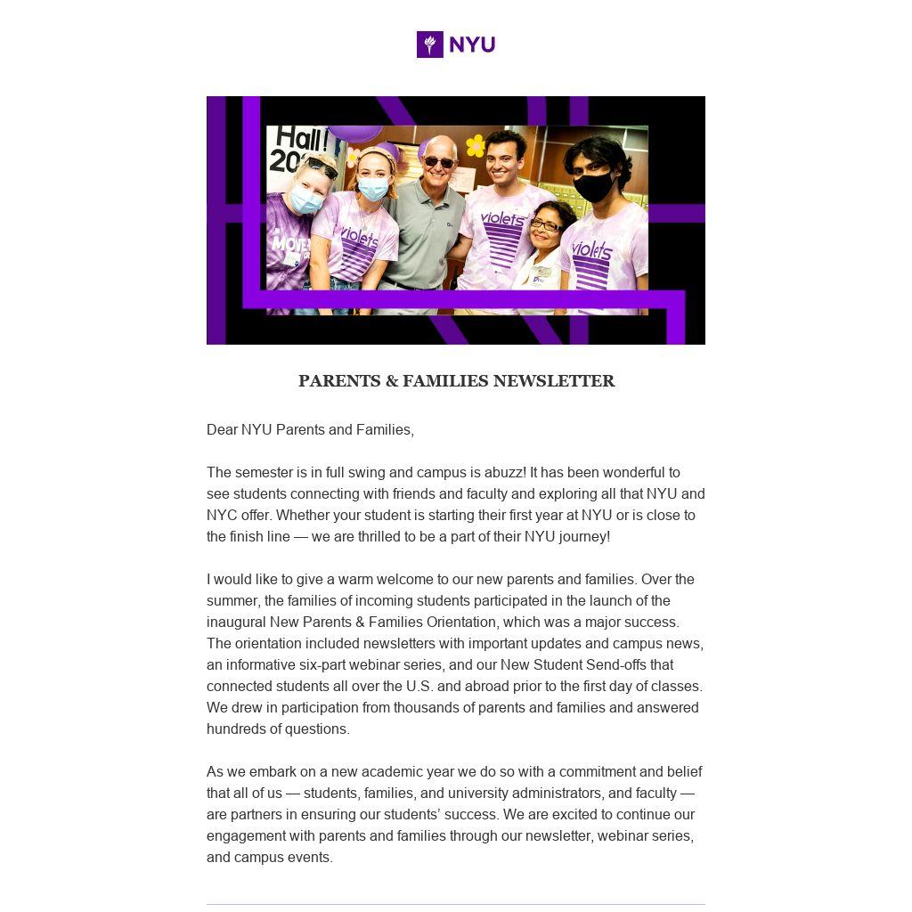 The semester is in full swing and campus is abuzz! It has been wonderful to see students connecting with friends and faculty and exploring all that NYU and NYC offer. Whether your student is starting their first year at NYU or is close to the finish line — we are thrilled to be a part of their NYU journey!