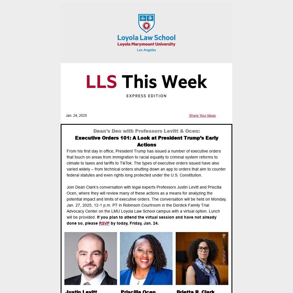 Join Dean Clark’s conversation with legal experts Professors Justin Levitt and Priscilla Ocen, where they will review many of these actions as a means for analyzing the potential impact and limits of executive orders. The conversation will be held on Monday, Jan. 27, 2025, 12-1 p.m. PT in Robinson Courtroom in the Dordick Family Trial Advocacy Center on the LMU Loyola Law School campus with a virtual option. Lunch will be provided. If you plan to attend the virtual session and have not already done so, please RSVP by today, Friday, Jan. 24.