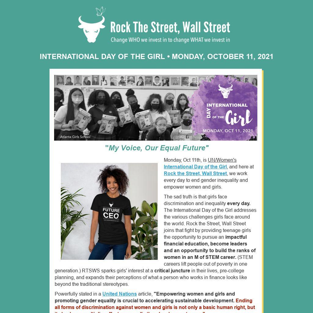 The sad truth is that girls face discrimination and inequality every day. The International Day of the Girl addresses the various challenges girls face around the world. Rock the Street, Wall Street joins that fight by providing teenage girls the opportunity to pursue an impactful financial education, become leaders and an opportunity to build the ranks of women in an M of STEM career. (STEM careers lift people out of poverty in one generation.) RTSWS sparks girls' interest at a critical juncture in their lives, pre-college planning, and expands their perceptions of what a person who works in finance looks like beyond the traditional stereotypes.