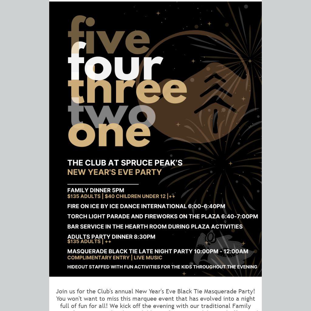 Join us for the Club's annual New Year's Eve Black Tie Masquerade Party! You won't want to miss this marquee event that has evolved into a night full of fun for all! We kick off the evening with our traditional Family Dinner from 5pm in The Alpine Clubhouse featuring a delicious buffet meal timed so you can enjoy all of the campus festivities.