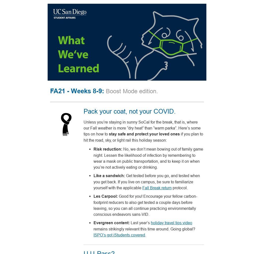 Boost Mode. Level up your COVID-19 protection with a booster shot before the holidays by making an appointment at the Price Center or an off-campus clinic.