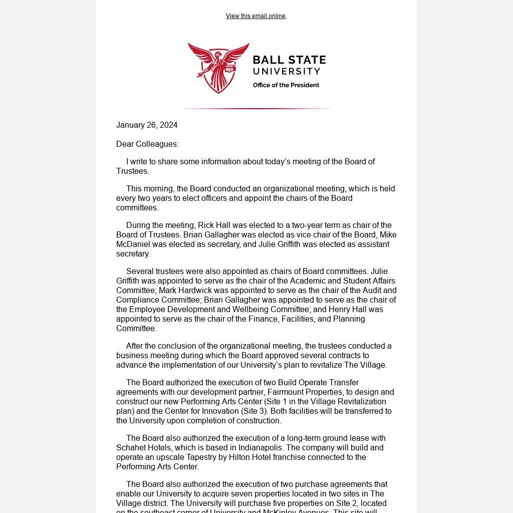 I am grateful to our trustees for their continued support of this important initiative, which I believe will enhance the vibrancy of our campus and will improve the quality of life for our friends and neighbors in East Central Indiana. And as a result of today’s Board actions, we are much closer to that brighter future.