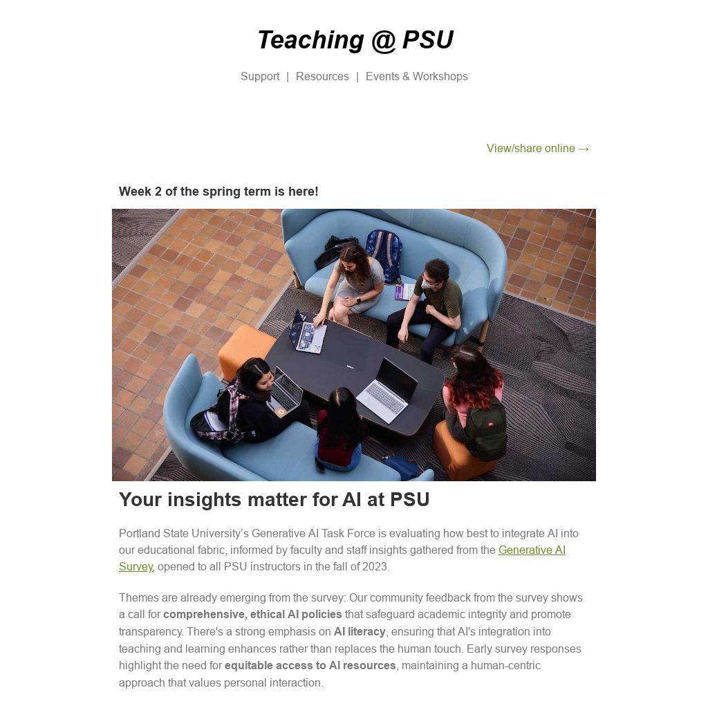 Portland State University’s Generative AI Task Force is evaluating how best to integrate AI into our educational fabric, informed by faculty and staff insights gathered from the Generative AI Survey, opened to all PSU instructors in the fall of 2023.