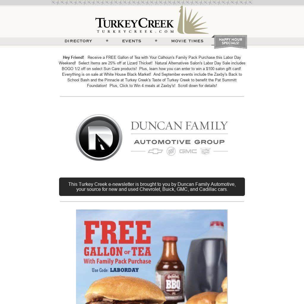 Hey Friend! Receive a FREE Gallon of Tea with Your Calhoun's Family Pack Purchase this Labor Day Weekend! Select Items are 25% off at Lizard Thicket! Natural Alternatives Salon's Labor Day Sale includes BOGO 1/2 off on select Sun Care products! Plus, learn how you can enter to win a $100 salon gift card! Everything is on sale at White House Black Market! And September events include the Zaxby's Back to School Bash and the Pinnacle at Turkey Creek's Taste of Turkey Creek to benefit the Pat Summitt Foundation! Plus, Click to Win 4 meals at Zaxby's! Scroll down for details!