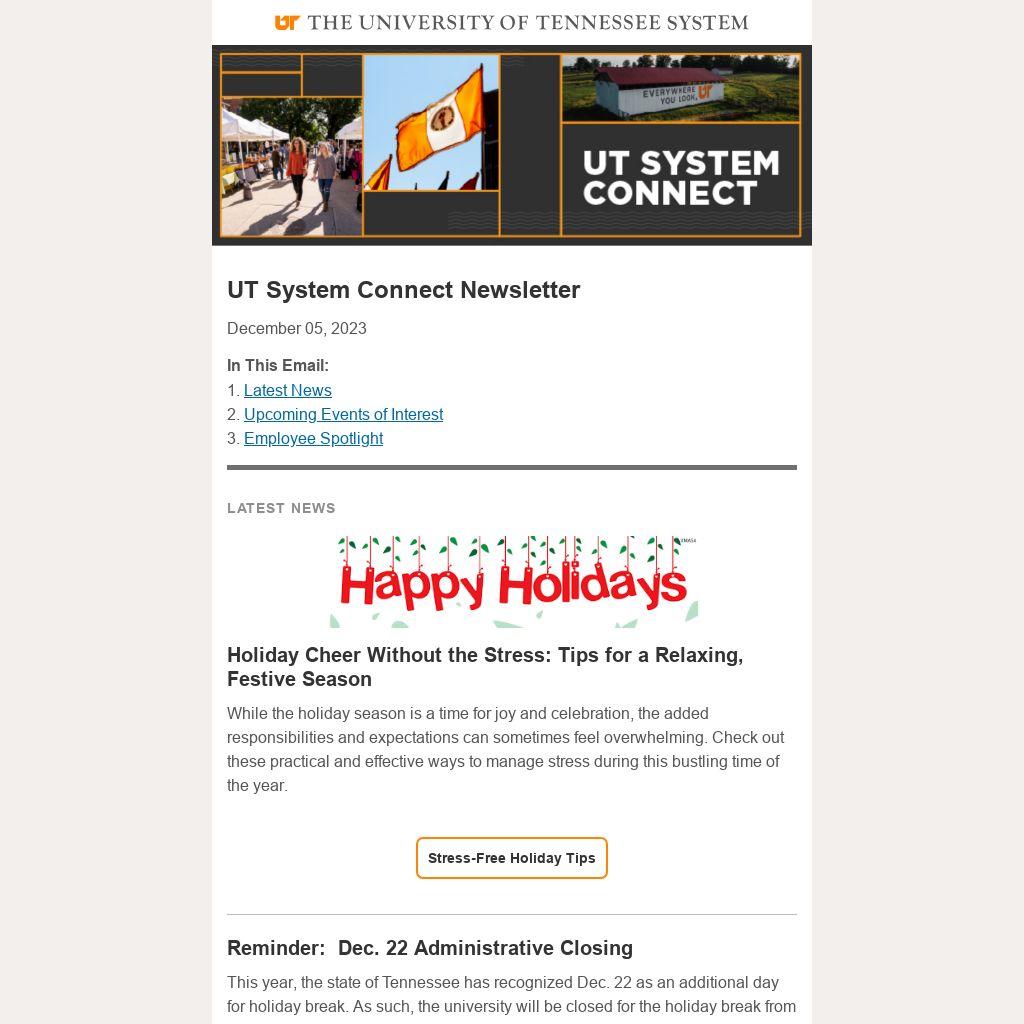 This year, the state of Tennessee has recognized Dec. 22 as an additional day for holiday break. As such, the university will be closed for the holiday break from Dec. 22, 2023 through Jan. 1, 2024.