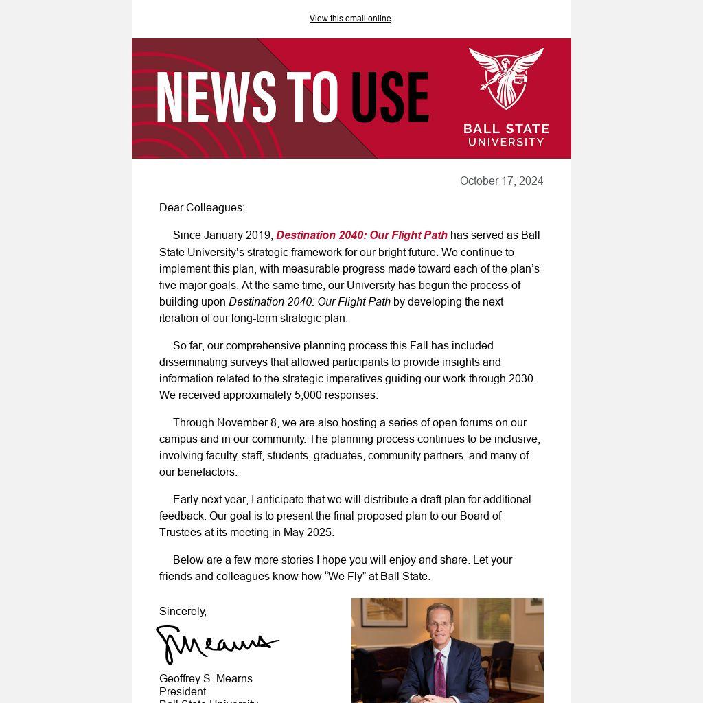 Copyright © 2024 Ball State University, All rights reserved. News and updates from Ball State's president.