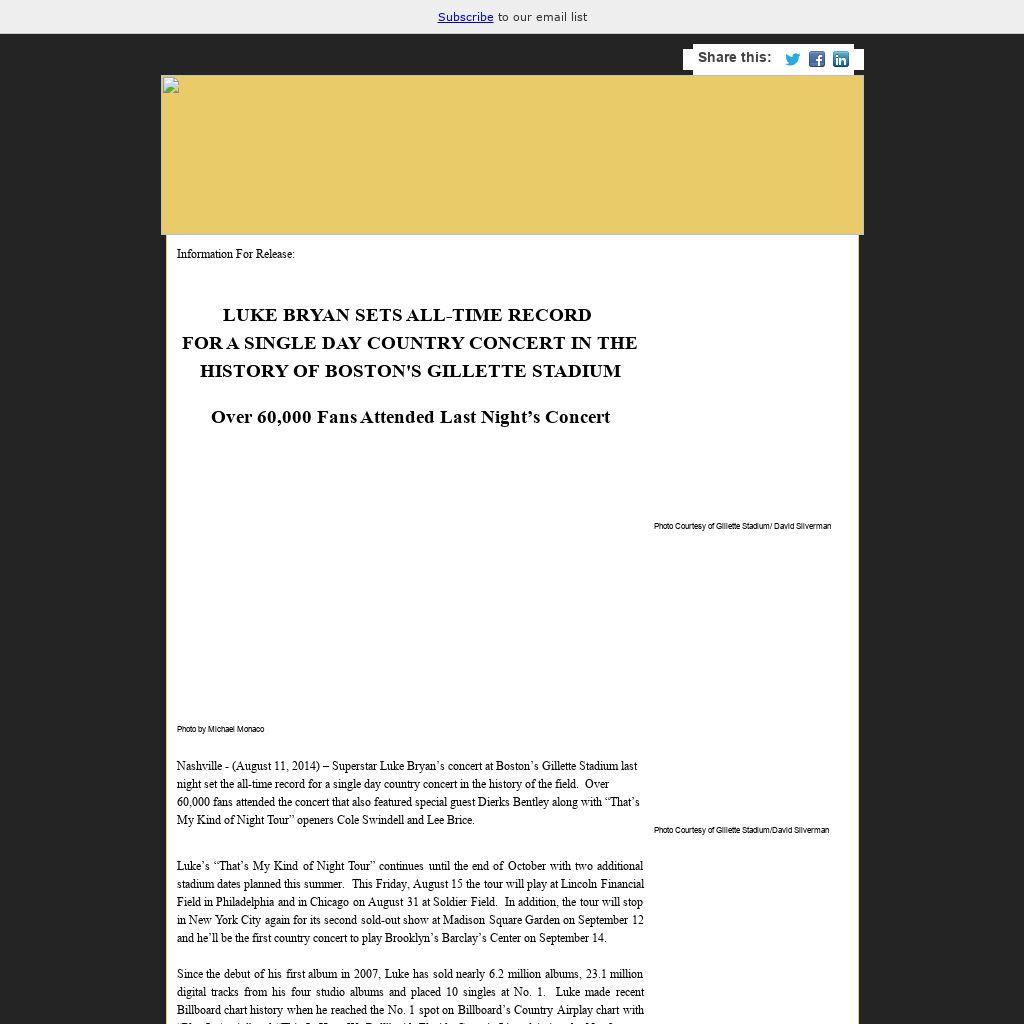 Nashville - (August 11, 2014) – Superstar Luke Bryan’s concert at Boston’s Gillette Stadium last night set the all-time record for a single day country concert in the history of the field. Over 60,000 fans attended the concert that also featured special guest Dierks Bentley along with “That’s My Kind of Night Tour” openers Cole Swindell and Lee Brice.