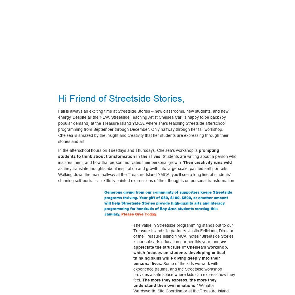 The value in Streetside programming stands out to our Treasure Island site partners. Justin Feliciano, Director of the Treasure Island YMCA, notes “Streetside Stories is our sole arts education partner this year, and we appreciate the structure of Chelsea’s workshop, which focuses on students developing critical thinking skills while diving deeply into their personal lives. Some of the kids we work with experience trauma, and the Streetside workshop provides a safe space where kids can express how they feel. The more they express, the more they understand their own emotions.” Wilnatta Wardsworth, Site Coordinator at the Treasure Island YMCA adds, “Our program is small and intimate - Chelsea and Streetside Stories are a breath of fresh air. At first students thought art would be really hard, but Chelsea makes it accessible, and it’s not as hard as they thought. The class is really fun for our kids - they create video, photography, drawing, and they just love Ms. Chelsea.”