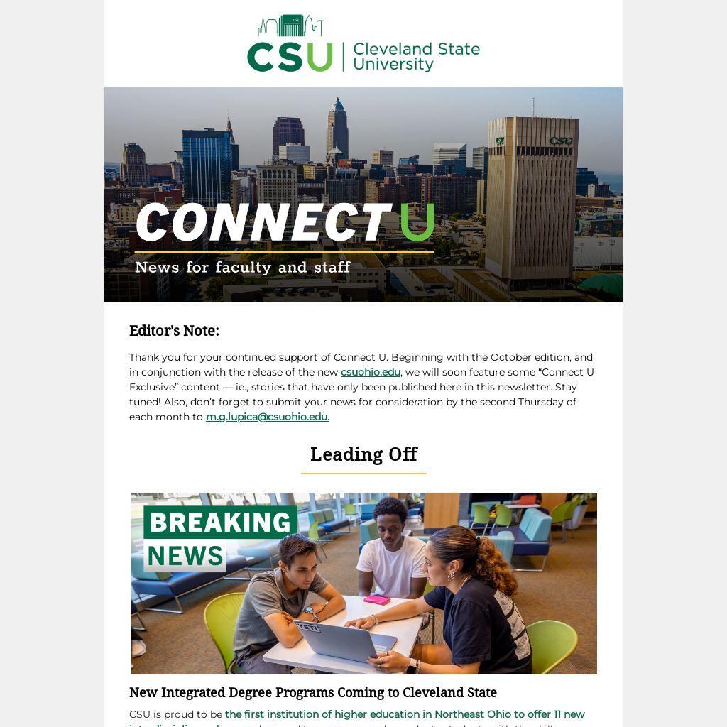 Thank you for your continued support of Connect U. Beginning with the October edition, and in conjunction with the release of the new csuohio.edu, we will soon feature some “Connect U Exclusive” content — ie., stories that have only been published here in this newsletter. Stay tuned! Also, don’t forget to submit your news for consideration by the second Thursday of each month to m.g.lupica@csuohio.edu.