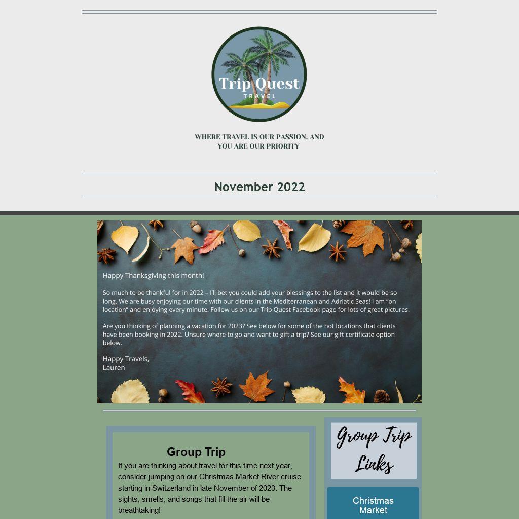 I am Lauren Williams, owner of Trip Quest Travel Services for the past seven years. Moving from three decades in education to becoming a travel consultant has caused me to shift from “The Doctor of Education” to “The Doctor of Travel.” My clients are often just like me – they want a rejuvenating vacation that teaches them about the world and the cultures around them. I love beautiful scenery, exploring new places, and learning something new every day! Aside from travel, I stay busy with my husband, Steve, and our four children and thirteen grandchildren. Being active in the church and in our community feeds our souls as well. I love to play pickleball and bridge when I am not helping clients plan that perfect trip! Because our world is so much smaller now, I am happy to work with clients wherever they might live…but by referral only. Let me know if you have friends or family who would like to added to my monthly newsletter list! Also, let me know if there is something you’d like to know more about!