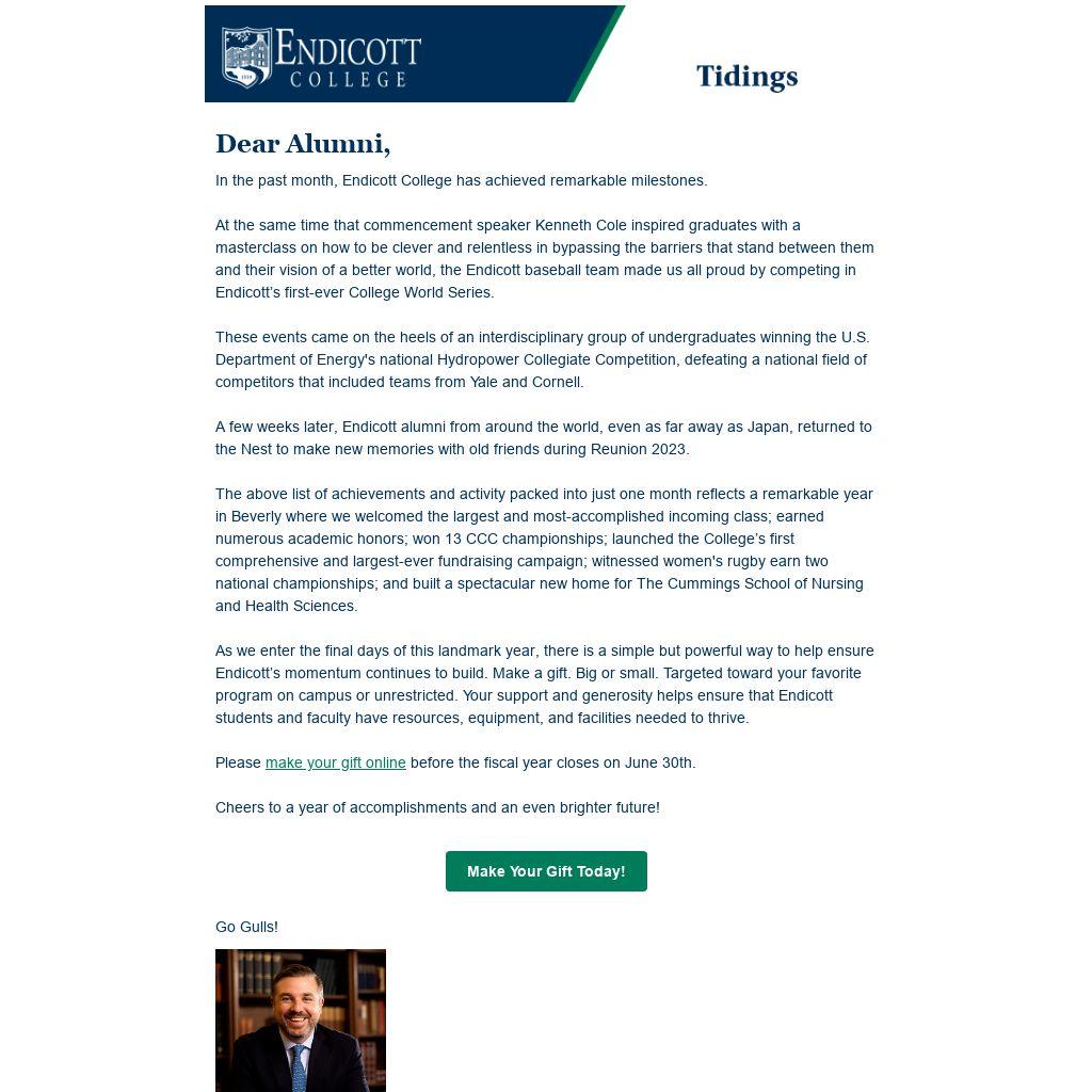 As we enter the final days of this landmark year, there is a simple but powerful way to help ensure Endicott’s momentum continues to build. Make a gift. Big or small. Targeted toward your favorite program on campus or unrestricted. Your support and generosity helps ensure that Endicott students and faculty have resources, equipment, and facilities needed to thrive.