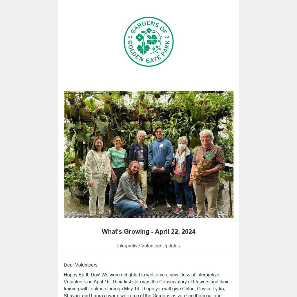 Happy Earth Day! We were delighted to welcome a new class of Interpretive Volunteers on April 16. Their first stop was the Conservatory of Flowers and their training will continue through May 14. I hope you will give Chloe, Geysa, Lydia, Shayan, and Laura a warm welcome at the Gardens as you see them out and about.