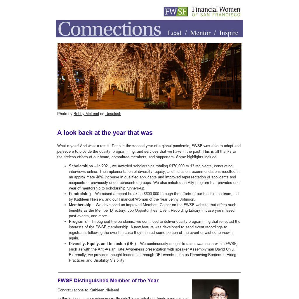 - Diversity, Equity, and Inclusion (DEI) – We continuously sought to raise awareness within FWSF, such as with the Anti-Asian Hate Awareness presentation with speaker Assemblyman David Chiu. Externally, we provided thought leadership through DEI events such as Removing Barriers in Hiring Practices and Disability Visibility.