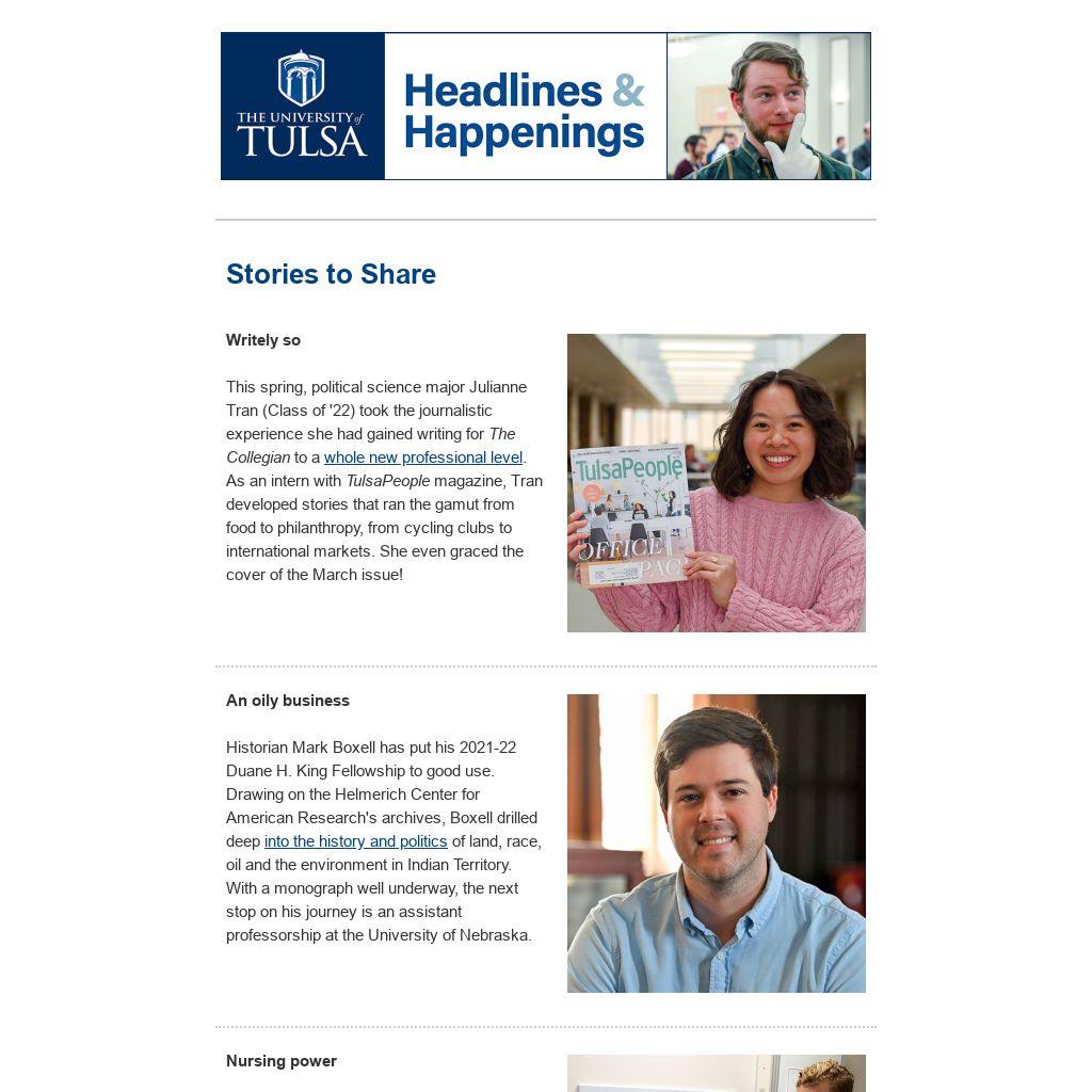 This spring, political science major Julianne Tran (Class of '22) took the journalistic experience she had gained writing for The Collegian to a whole new professional level. As an intern with TulsaPeople magazine, Tran developed stories that ran the gamut from food to philanthropy, from cycling clubs to international markets. She even graced the cover of the March issue!