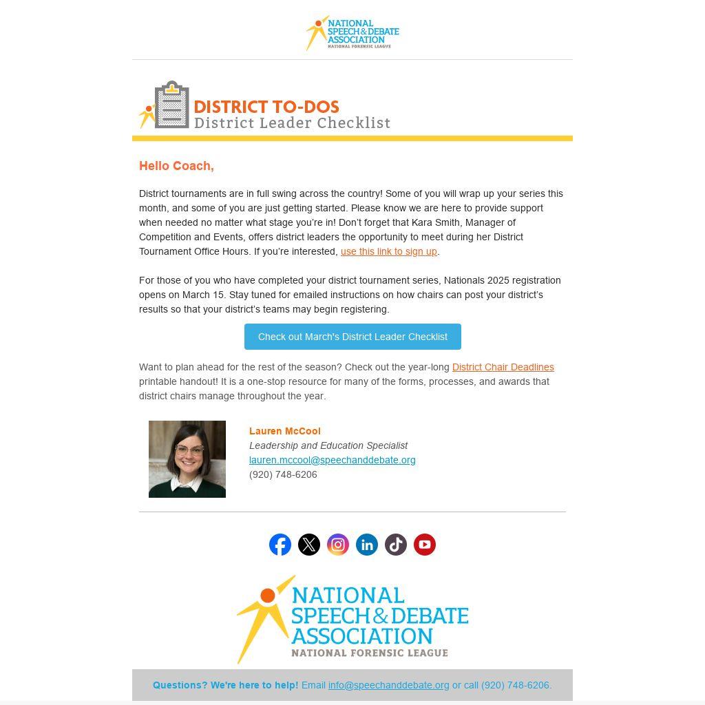 For those of you who have completed your district tournament series, Nationals 2025 registration opens on March 15. Stay tuned for emailed instructions on how chairs can post your district’s results so that your district’s teams may begin registering.