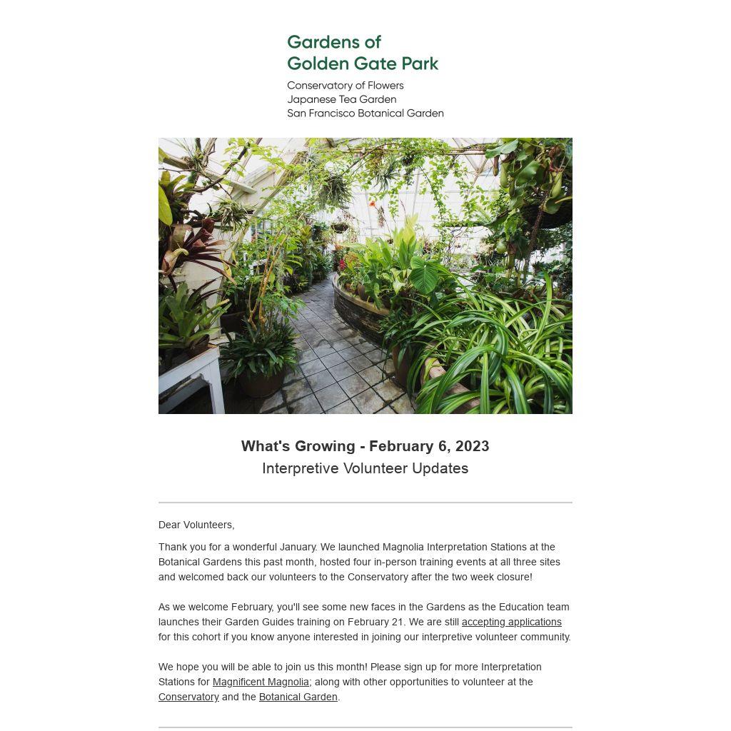 Thank you for engaging 1,059 visitors during January! Our interpretive volunteer community engaged 699 visitors at the Botanical Garden and 360 visitors at the Conservatory of Flowers, even with the closure.Please remember to share your engagement numbers. If you run into any issues recording your engagement numbers, please let me know.