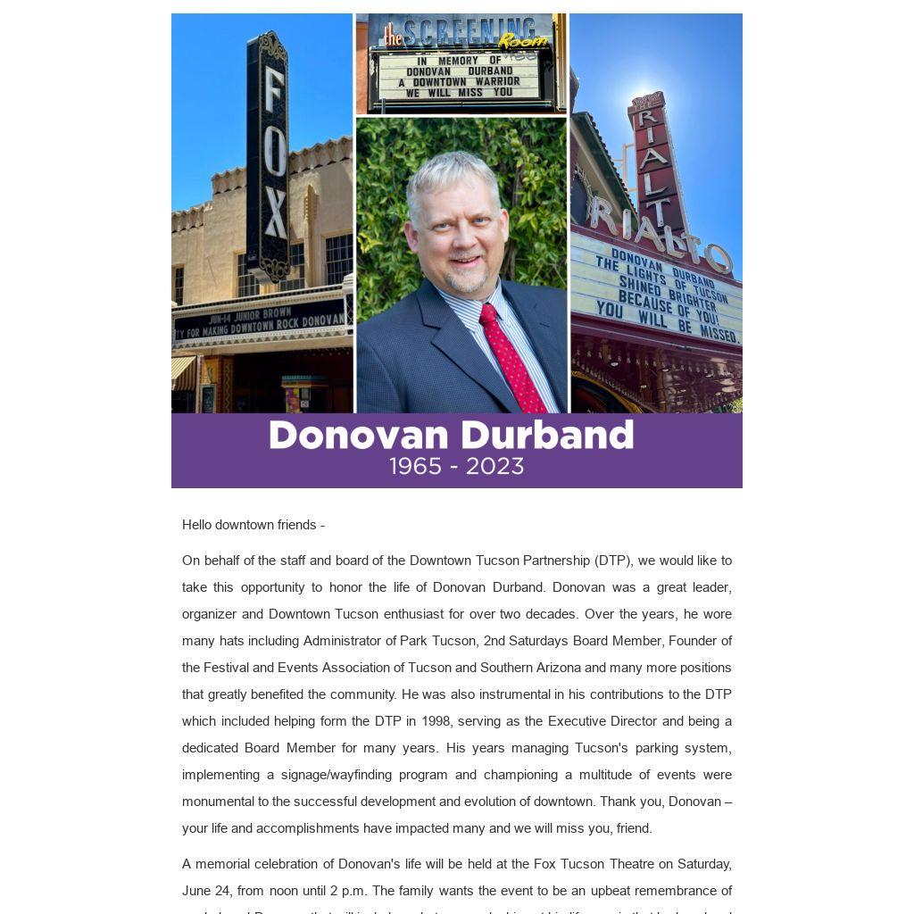 On behalf of the staff and board of the Downtown Tucson Partnership (DTP), we would like to take this opportunity to honor the life of Donovan Durband. Donovan was a great leader, organizer and Downtown Tucson enthusiast for over two decades. Over the years, he wore many hats including Administrator of Park Tucson, 2nd Saturdays Board Member, Founder of the Festival and Events Association of Tucson and Southern Arizona and many more positions that greatly benefited the community. He was also instrumental in his contributions to the DTP which included helping form the DTP in 1998, serving as the Executive Director and being a dedicated Board Member for many years. His years managing Tucson's parking system, implementing a signage/wayfinding program and championing a multitude of events were monumental to the successful development and evolution of downtown. Thank you, Donovan – your life and accomplishments have impacted many and we will miss you, friend.