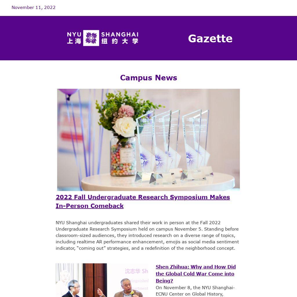 For a complete listing of events at NYU Shanghai, check out the Weekly Events Newsletter, delivered to your inbox every Monday when school is in session. If you wish to highlight your event in the Weekly Events Newsletter, upload your event to Engage no later than the Thursday before the Monday newsletter.