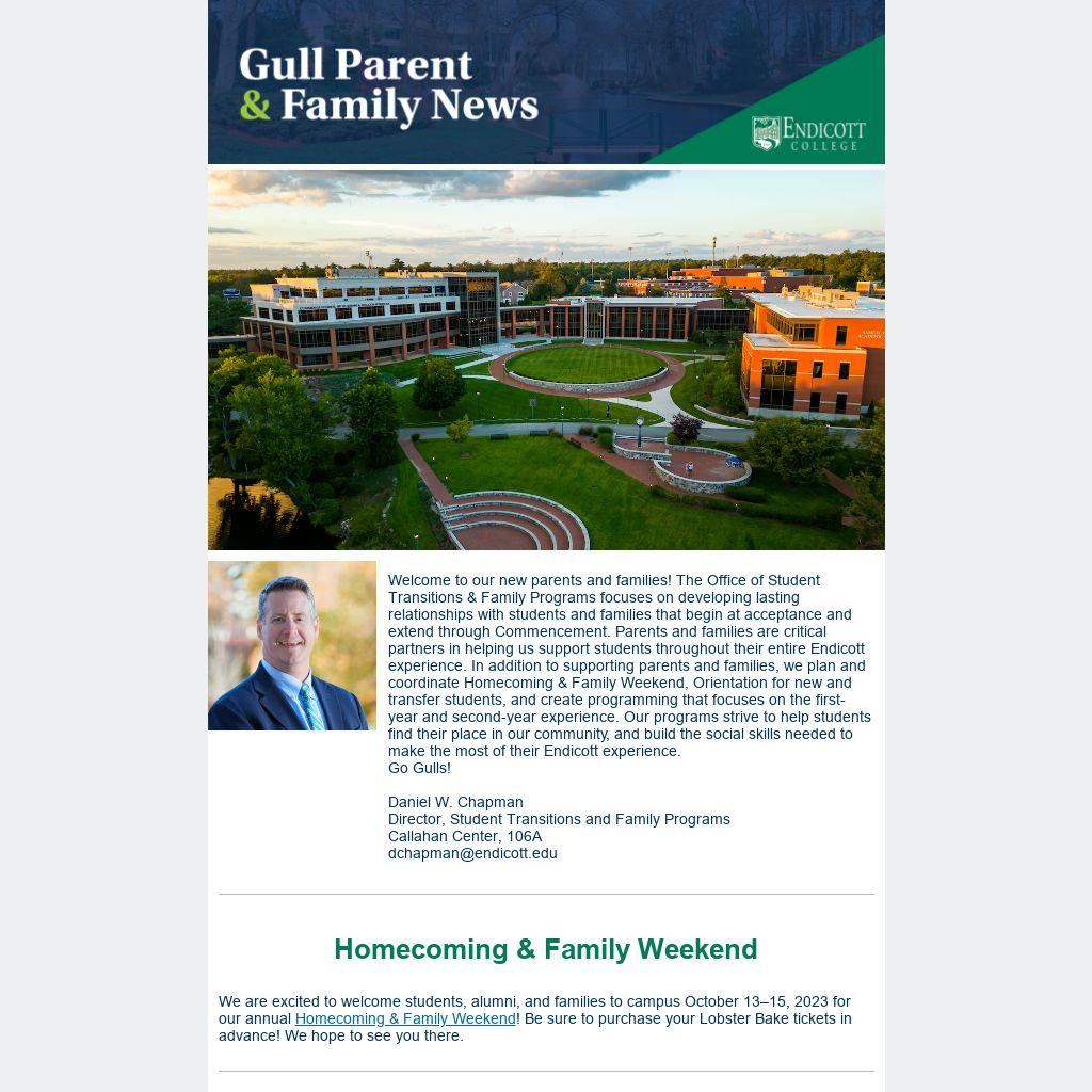 Welcome to our new parents and families! The Office of Student Transitions & Family Programs focuses on developing lasting relationships with students and families that begin at acceptance and extend through Commencement. Parents and families are critical partners in helping us support students throughout their entire Endicott experience. In addition to supporting parents and families, we plan and coordinate Homecoming & Family Weekend, Orientation for new and transfer students, and create programming that focuses on the first-year and second-year experience. Our programs strive to help students find their place in our community, and build the social skills needed to make the most of their Endicott experience.