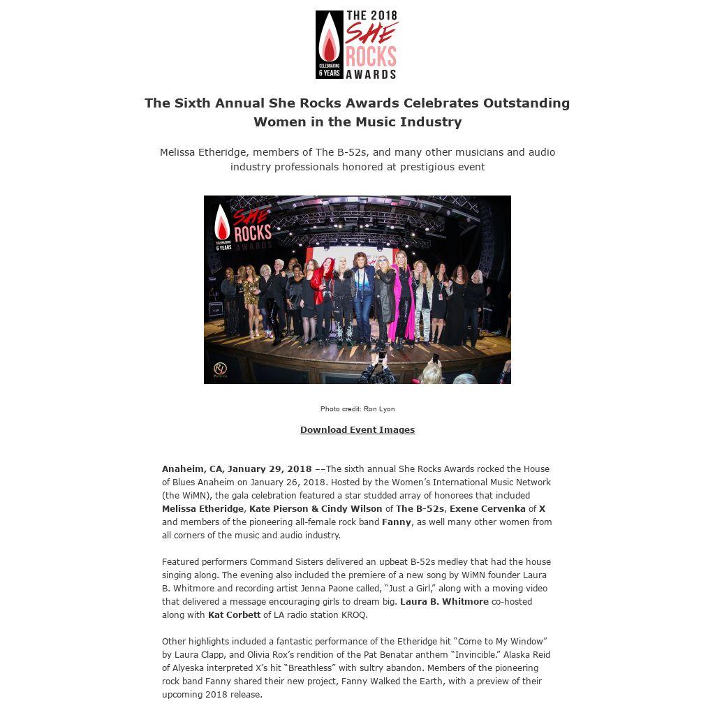 Anaheim, CA, January 29, 2018 ––The sixth annual She Rocks Awards rocked the House of Blues Anaheim on January 26, 2018. Hosted by the Women’s International Music Network (the WiMN), the gala celebration featured a star studded array of honorees that included Melissa Etheridge, Kate Pierson & Cindy Wilson of The B-52s, Exene Cervenka of X and members of the pioneering all-female rock band Fanny, as well many other women from all corners of the music and audio industry.
