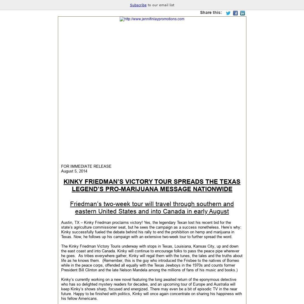 Austin, TX – Kinky Friedman proclaims victory! Yes, the legendary Texan lost his recent bid for the state’s agriculture commissioner seat, but he sees the campaign as a success nonetheless. Here’s why: Kinky successfully fueled the debate behind his rally to end the prohibition on hemp and marijuana in Texas. Now, he follows up his campaign with an extensive two-week tour to further spread the word.