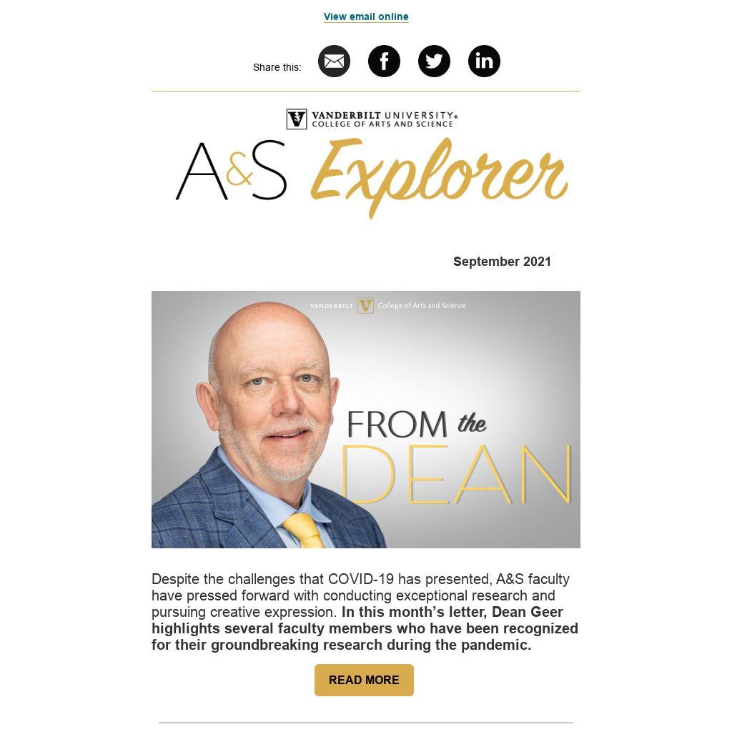 Despite the challenges that COVID-19 has presented, A&S faculty have pressed forward with conducting exceptional research and pursuing creative expression. In this month’s letter, Dean Geer highlights several faculty members who have been recognized for their groundbreaking research during the pandemic.