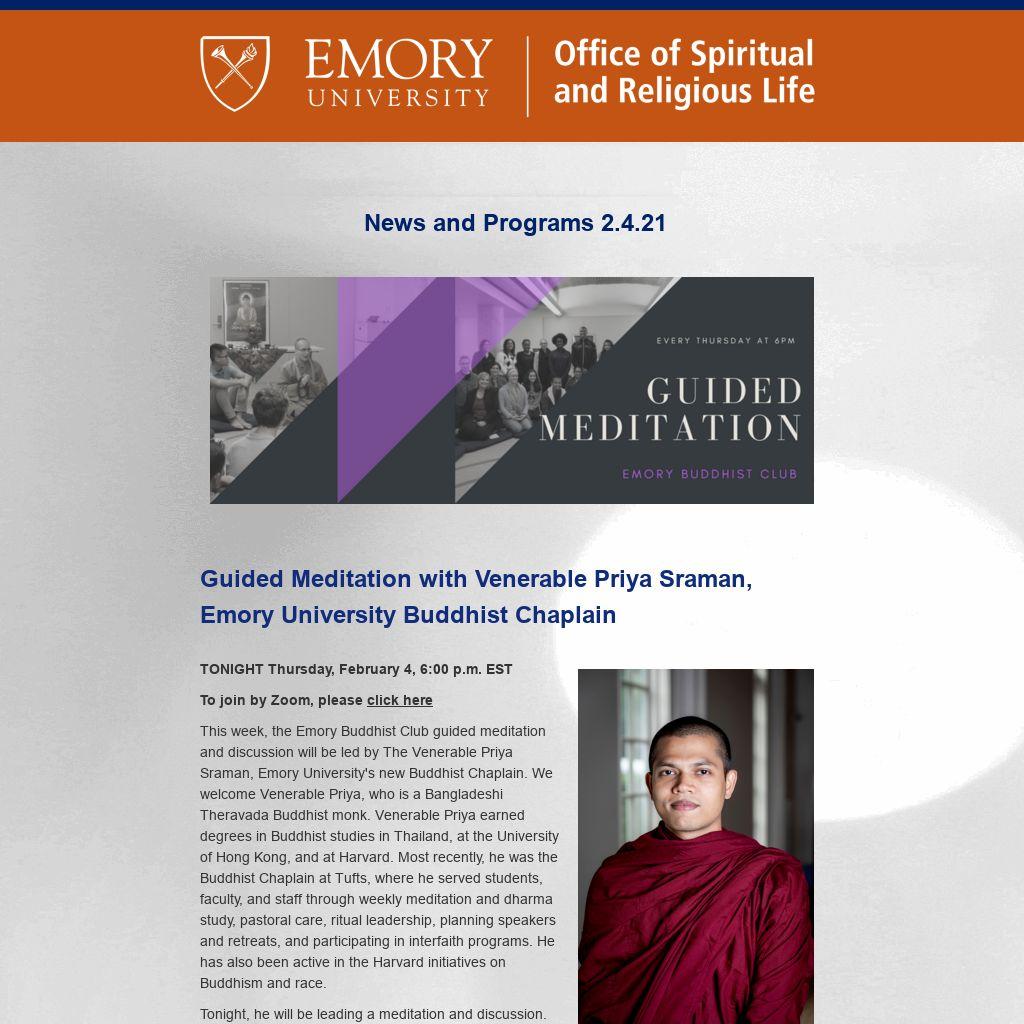 Emory OSRL Enews is published weekly during term by the Emory University Office of Spiritual and Religious Life covering Atlanta-campus programs. For Oxford College spiritual life, please click here. To submit information or to update your preferences, please contact religiouslife@emory.edu.