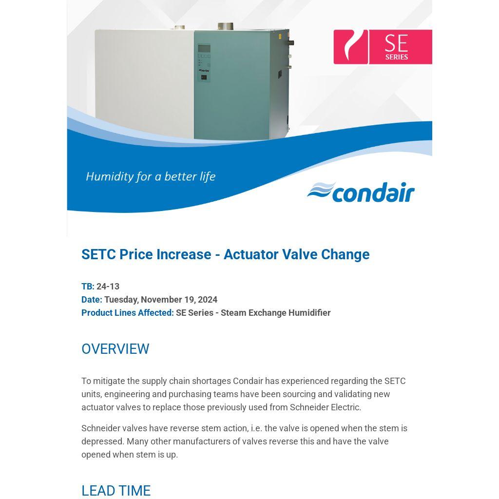 To mitigate the supply chain shortages Condair has experienced regarding the SETC units, engineering and purchasing teams have been sourcing and validating new actuator valves to replace those previously used from Schneider Electric.