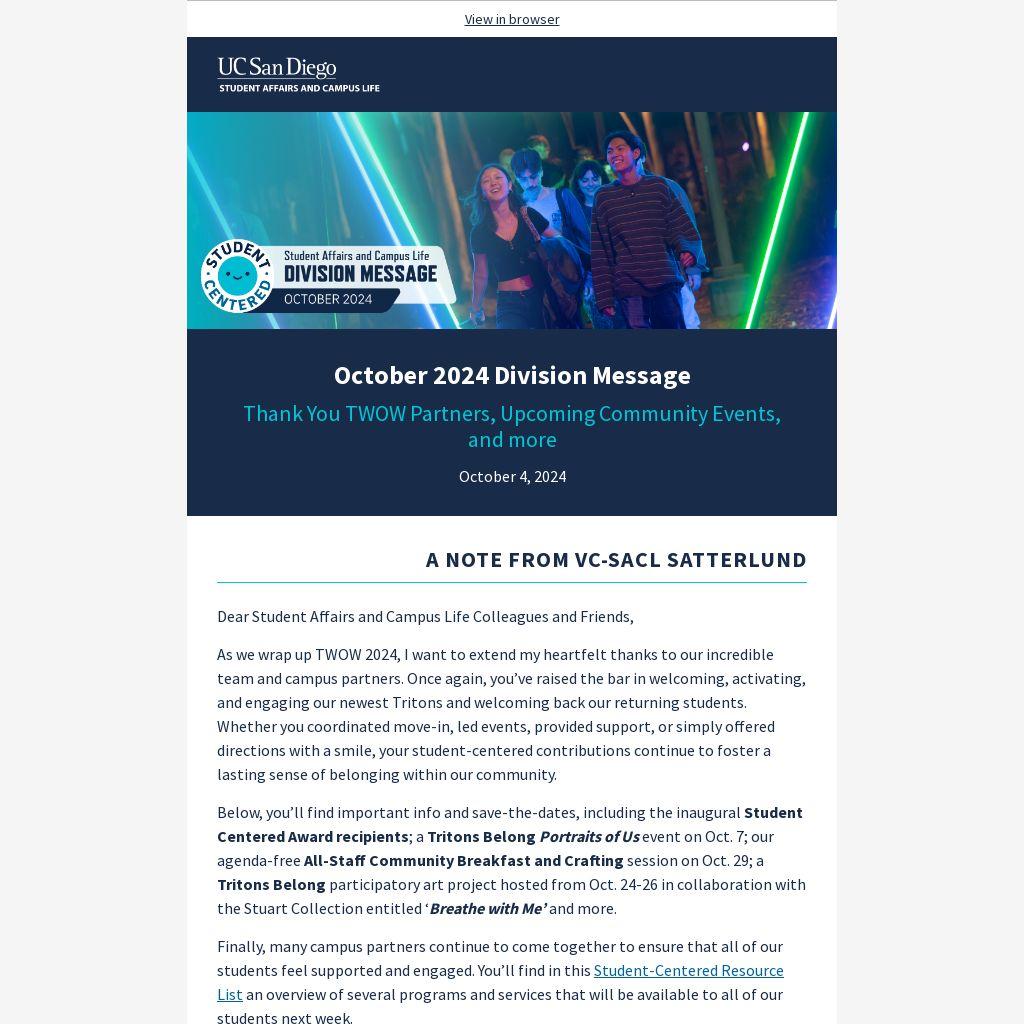 As we wrap up TWOW 2024, I want to extend my heartfelt thanks to our incredible team and campus partners. Once again, you’ve raised the bar in welcoming, activating, and engaging our newest Tritons and welcoming back our returning students. Whether you coordinated move-in, led events, provided support, or simply offered directions with a smile, your student-centered contributions continue to foster a lasting sense of belonging within our community.