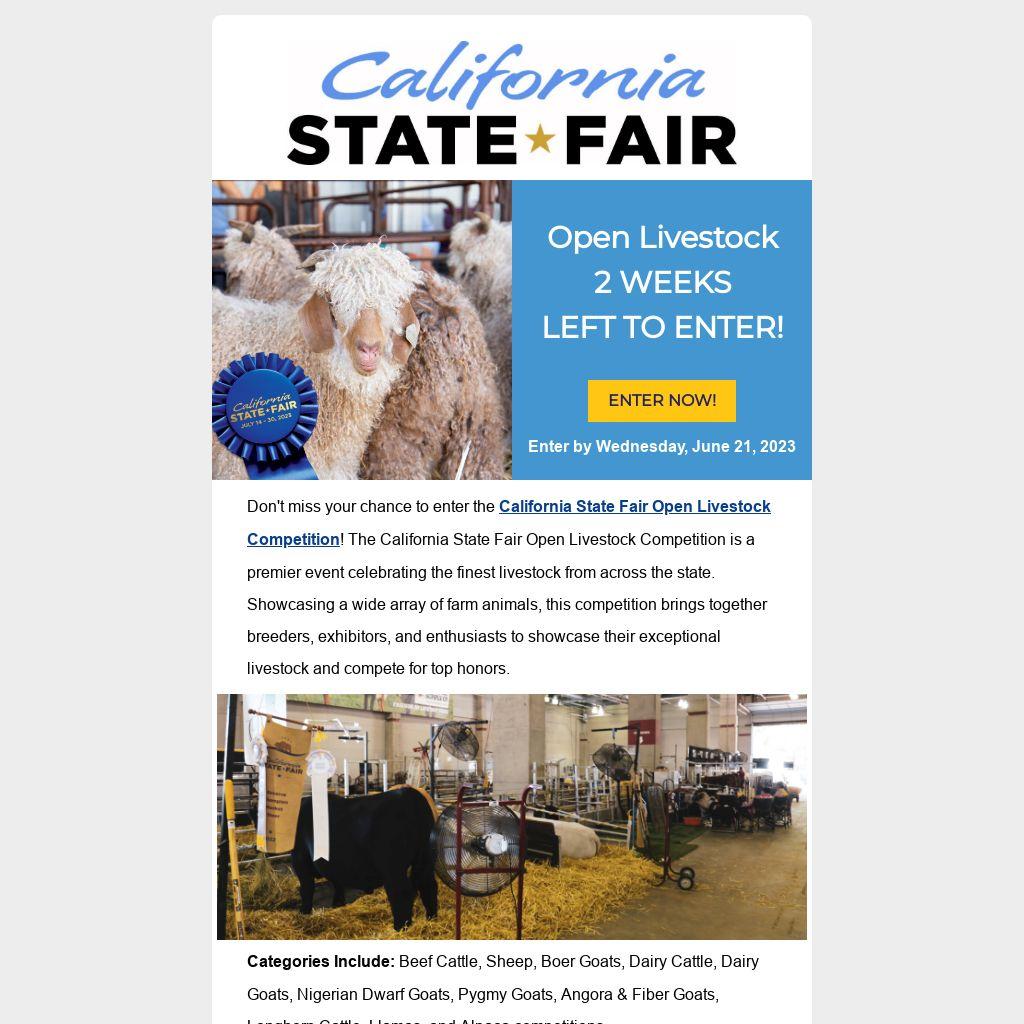 Don't miss your chance to enter the California State Fair Open Livestock Competition! The California State Fair Open Livestock Competition is a premier event celebrating the finest livestock from across the state. Showcasing a wide array of farm animals, this competition brings together breeders, exhibitors, and enthusiasts to showcase their exceptional livestock and compete for top honors.