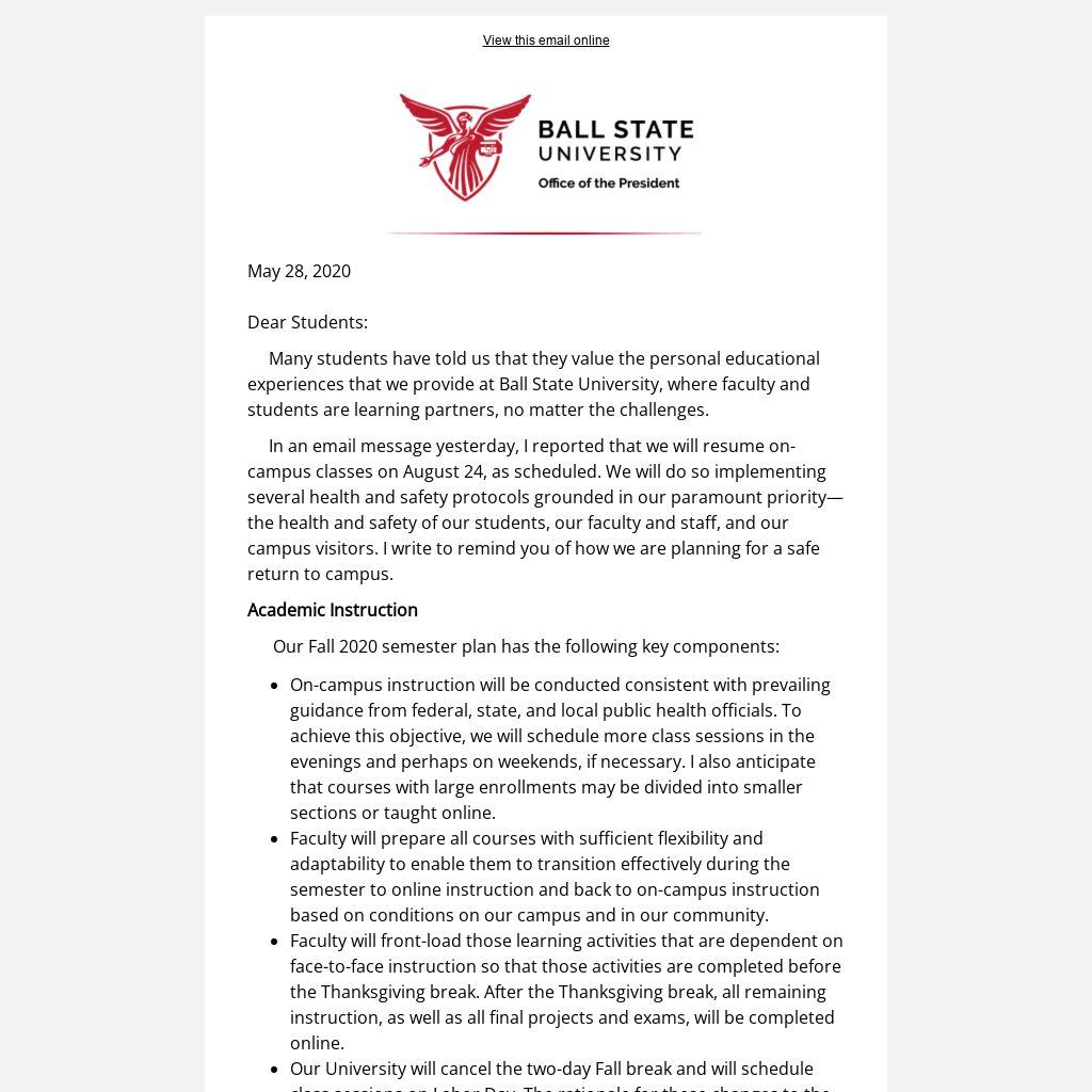 Our plan, which will be informed by guidance from public health officials, will enable our students to safely return to our residence halls in August. While we have not yet finalized all of the details of that plan, I anticipate that it will include the following key components: