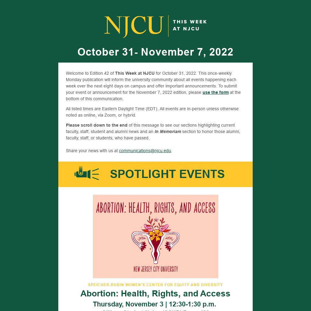 Welcome to Edition 42 of This Week at NJCU for October 31, 2022. This once-weekly Monday publication will inform the university community about all events happening each week over the next eight days on campus and offer important announcements. To submit your event or announcement for the November 7, 2022 edition, please use the form at the bottom of this communication.