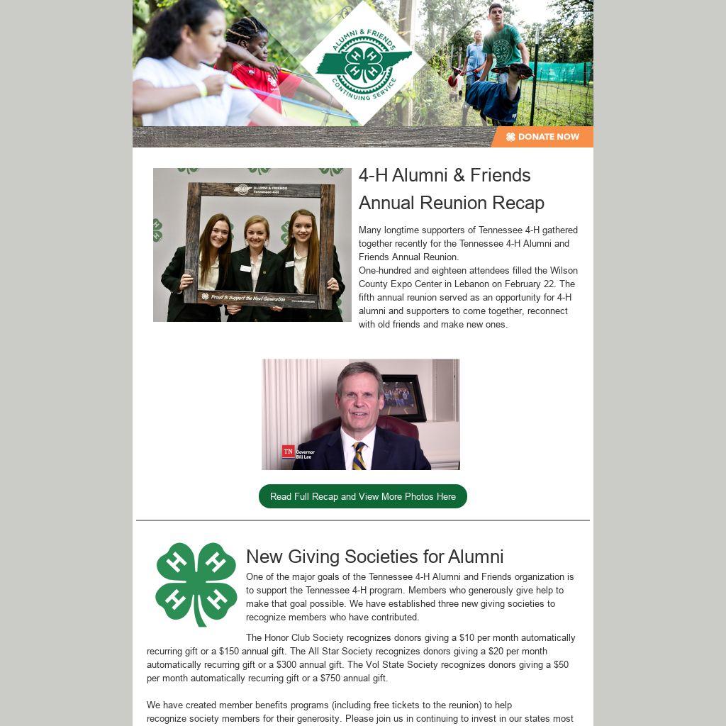 One of the major goals of the Tennessee 4-H Alumni and Friends organization is to support the Tennessee 4-H program. Members who generously give help to make that goal possible. We have established three new giving societies to recognize members who have contributed.