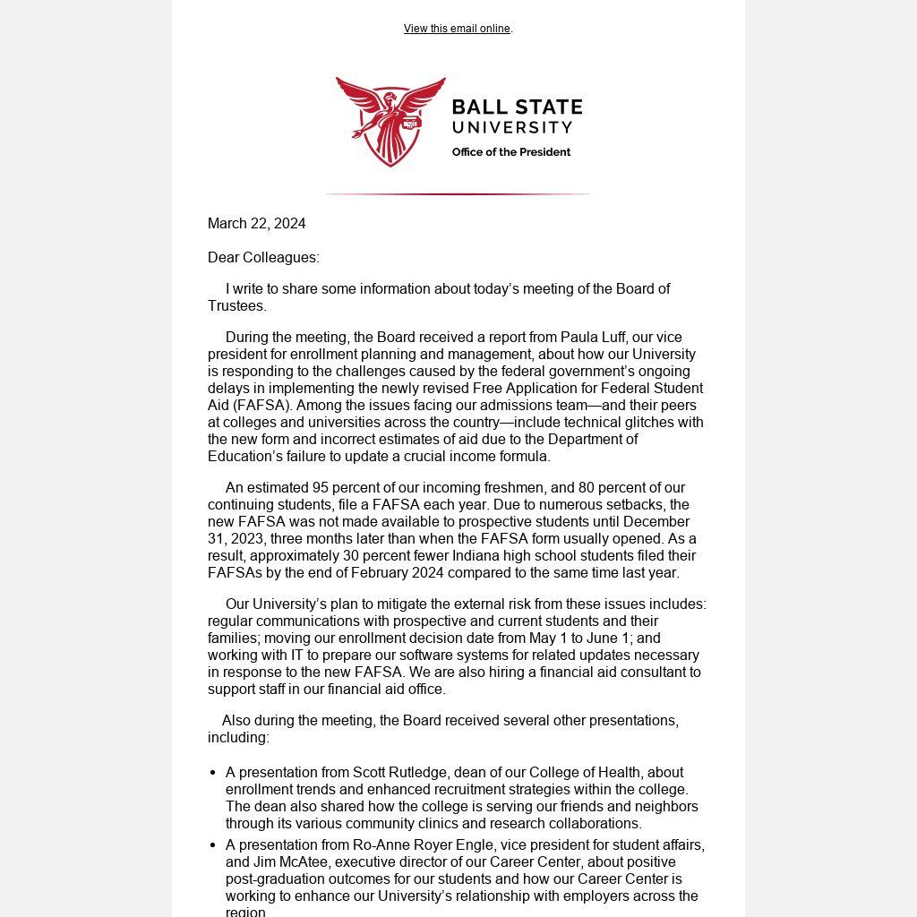 Copyright © 2024 Ball State University, All rights reserved. News and updates from Ball State University leadership are sent to faculty, staff, and students.