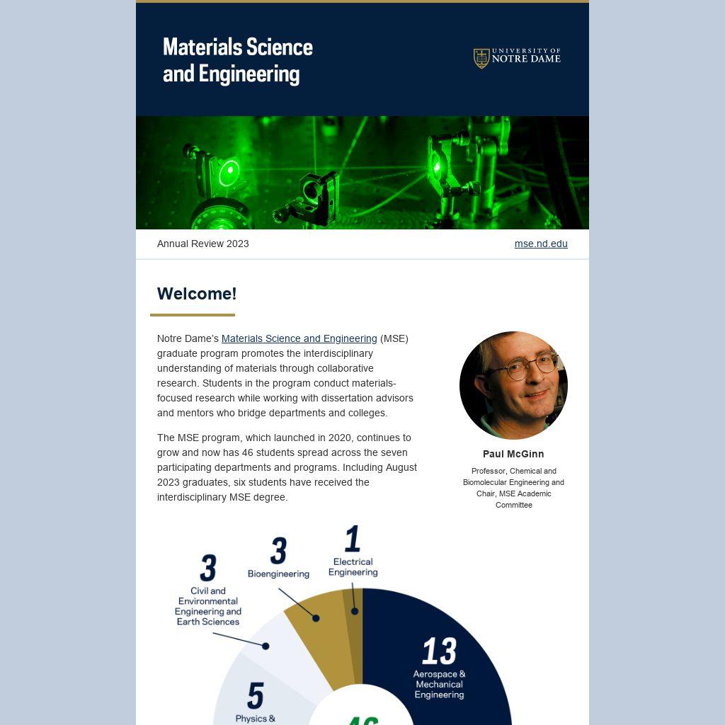Notre Dame’s Materials Science and Engineering (MSE) graduate program promotes the interdisciplinary understanding of materials through collaborative research. Students in the program conduct materials-focused research while working with dissertation advisors and mentors who bridge departments and colleges.