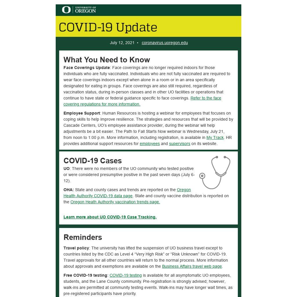 UO: There were no members of the UO community who tested positive or were considered presumptive positive in the past seven days (July 6-12).